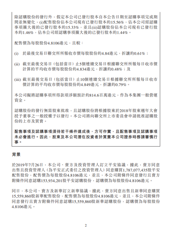 同日,公司、卖方及新华订立新华协议,据此,卖方出售且新华购买1555.99万股新华配售股份,配售价为每股股份4.8106港元,并且,公司附条件发行且卖方附条件认购1555.99万股新华认购股份,认购价为每股股份4.8106港元。